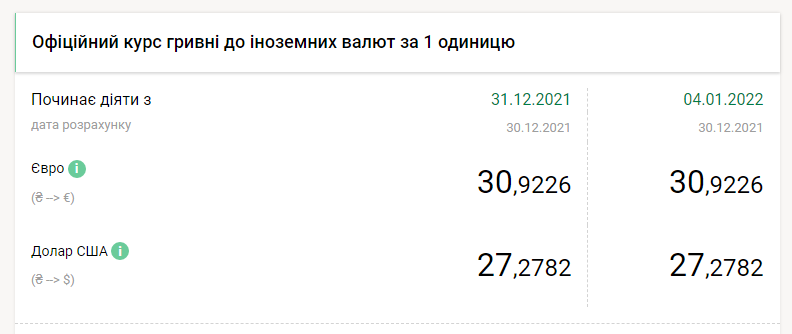 Национальный банк Украины на пятницу, 31 декабря, установил официальный курс гривны к американскому доллару на уровне 27.27 грн/$, передает FaceNews.ua. Об этом свидетельствуют данные на сайте регулятора.