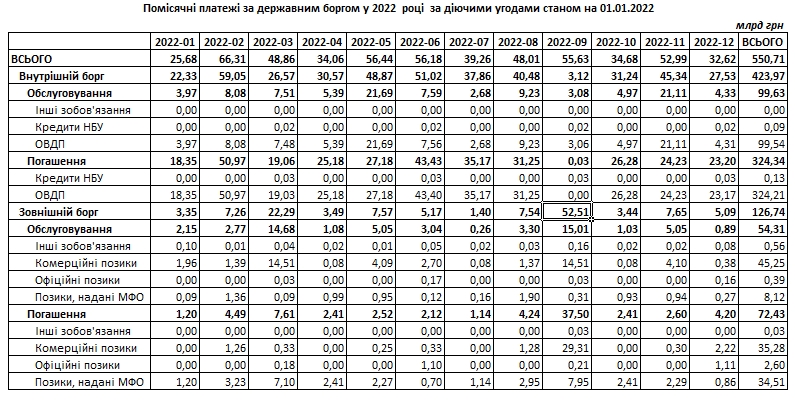 Министерство финансов Украины обнародовало график помесячных платежей по государственному долгу по действующим договорам по состоянию на 1 января 2022 года. За год необходимо выплатить 550,71 млрд гривен, в т.ч. по внутреннему долгу - 423,97 млрд гривен, по внешнему - 126,74 млрд гривен, передает FaceNews.ua.