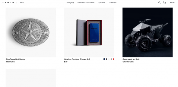 В магазине на официальном сайте компании за 835 Doge можно заказать пряжку для ремня с символикой Tesla, также в продаже за 12 020 Doge выставлен электроквадроцикл для детей.