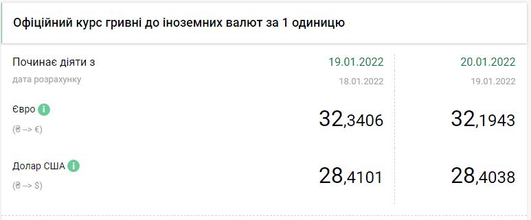 Национальный банк Украины на четверг, 20 января, укрепил курс гривны менее чем на 1 копейку по отношению к доллару и почти на 15 копеек к евро, передает FaceNews.ua. Об этом свидетельствуют данные на сайте НБУ/