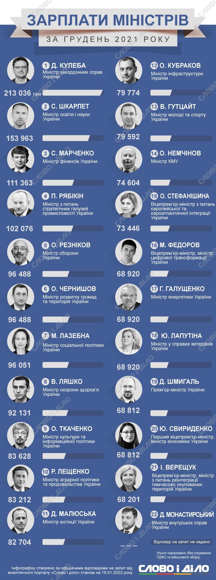 Около 92-96 тысяч получили Алексей Резников, Алексей Чернышов, Марина Лазебная и Виктор Ляшко. Среди глав министерств самая низкая зарплата в декабре составила около 68 тыс. грн.