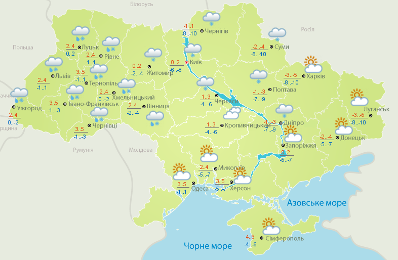 Из-за снега и плюсовой температуры на дорогах будет слякоть. В этой части Украины столбик термометра опустится ниже нуля только в Чернигове. Ветер синоптики прогнозируют северо-западный скоростью 5 – 10 метров в секунду.