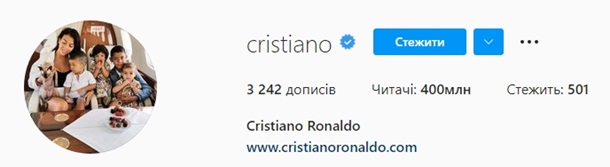 Нападающий футбольного клуба Манчестер Юнайтед и сборной Португалии Криштиану Роналду стал первым в мире, кому удалось набрать 400 миллионов подписчиков в Instagram, передает FaceNews.ua. Об этом этом сообщила Книга рекордов Гиннеса в Twitter.