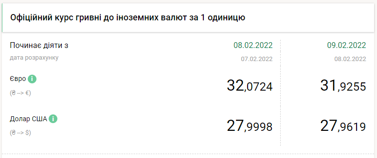 Национальный банк Украины на среду, 9 февраля, укрепил курс гривны почти на 4 копейки по отношению к доллару и на 14 копеек к евро, передает FaceNews.ua. Об этом свидетельствуют данные на сайте НБУ.
