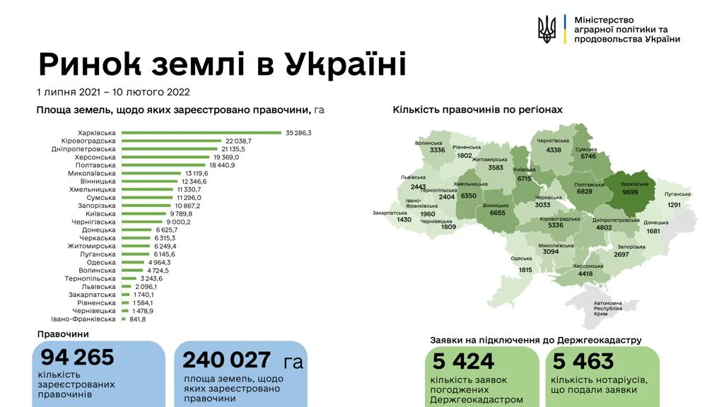 По количеству сделок лидируют Харьковская (9699), Полтавская (6828) и Сумская (6746) области. По общей стоимости проданной земли первое место занимает Киевская область (800,4 млн. грн.), за ней идут Харьковская (639,9 млн. грн.) и Полтавская (295,1 млн. грн.).