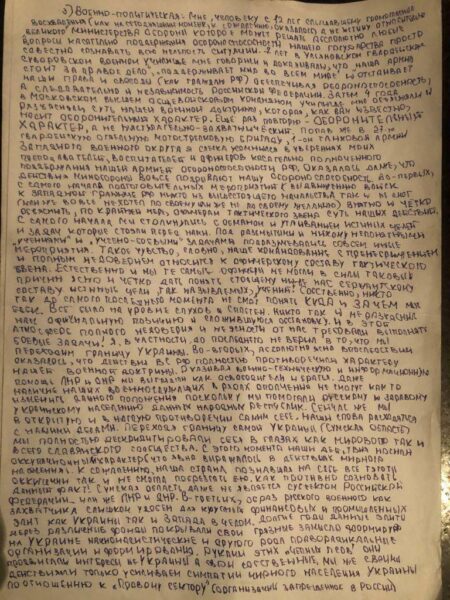 Командир 2 мотострелкового взвода 9 мотострелковой роты лейтенант А. Егоров указывает, что «(…) с самого начала мы столкнулись с обманом и утаиванием истинных целей и задач, которые стояли перед нами. Под разными и никому непонятными «учениями» и «учебно-боевыми задачами» подразумевались совсем иные мероприятия (…). Переходя границу Украины мы полностью дискредитировали себя в глазах, как мирового так и славянского сообщества. С этого момента наши действия носили оккупационный характер, что явно выражалось в действиях мирного населения (…)», — написал лейтенант ВС РФ Егоров.