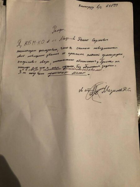 Так, сержант Мирапов Сапар Мерданович в рапорте командиру воинской части №61899 указывает: «(…) настоящим докладываю, что считаю невозможным свое повторное убытие по причине по причине плохой организации, отсутствия связи, технического обеспечения. Приехал, не понимая для чего я там нужен, без объяснения задачи. Я не хочу быть пушечным мясом», — заявил в рапорте сержант ВС РФ Мирапов.