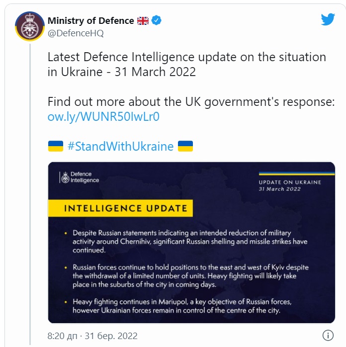 "Российские силы продолжают удерживать позиции к востоку и западу от Киева, несмотря на вывод ограниченного количества подразделений. В ближайшие дни в окрестностях города, скорее всего, развернутся ожесточенные бои", – идет речь в сообщении.