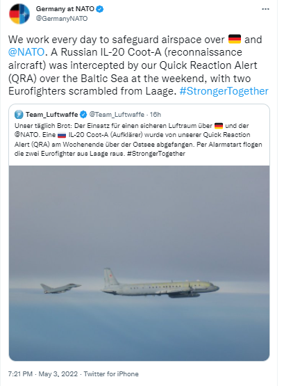 "Российский Ил-20 Кут-А (самолет-разведчик) был перехвачен нашей службой быстрого реагирования (QRA) над Балтийским морем в выходные дни, при этом два истребителя Eurofighter поднялись в воздух с Лааги", – говорится в публикации.
