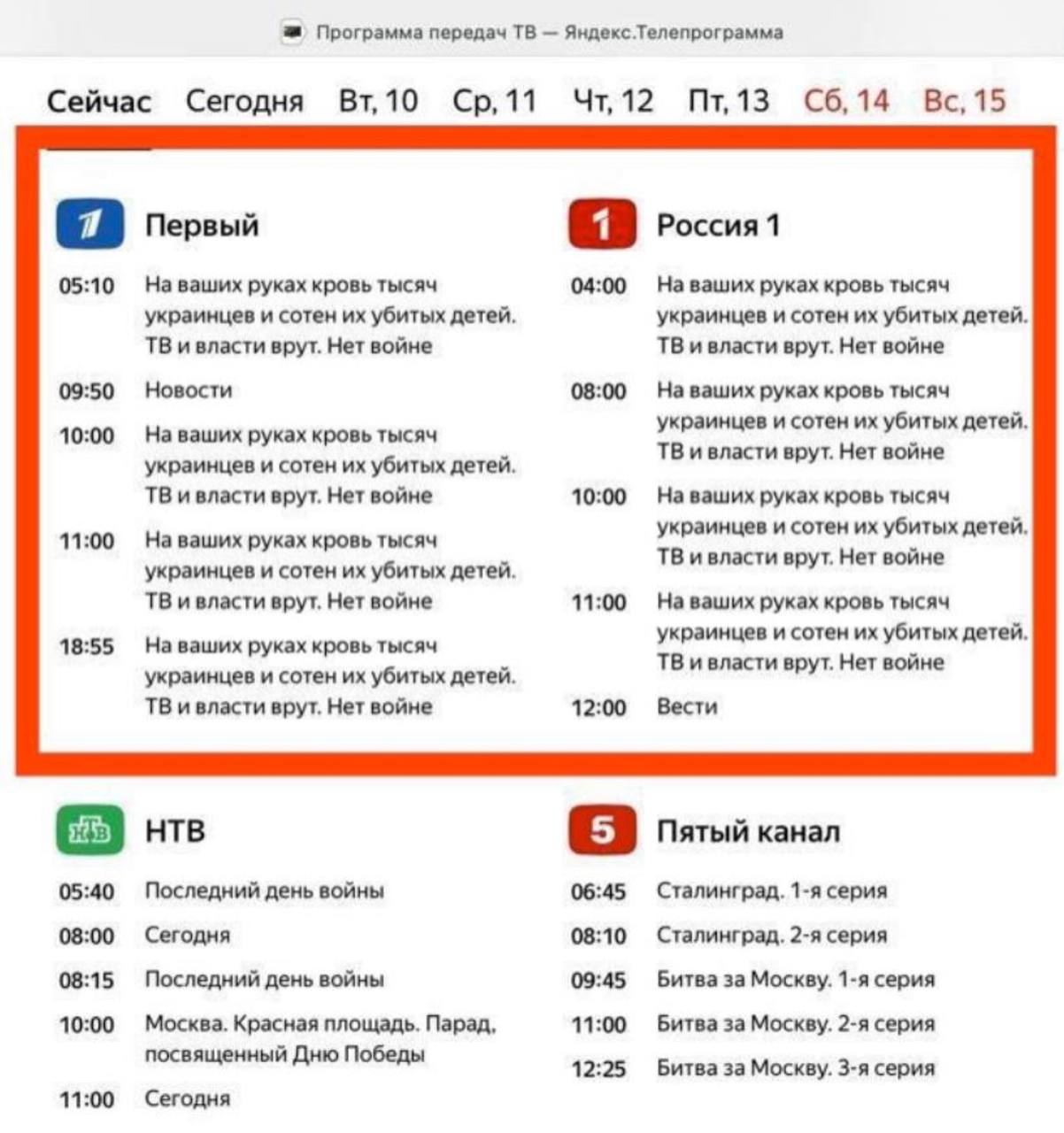 В России на 9 мая неизвестные взломали сеть вещания телеканалов. Вместо расписания телепрограммы россияне видят напоминание о том, что российская армия ведет войну против Украины и убивает тысячи людей. Об этом пишет российский сайт Readovka.