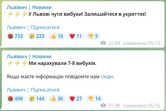 В местных телеграмм-каналах сообщают, что жители области насчитали 7-8 взрывов в промежутке приблизительно между 04:30 и 5 часами утра. Звуки взрывов были слышны и в самом Львове. Тем временем депутат Львовского горсовета Игорь Зинкевич пишет, что по области слышали 6 взрывов.
