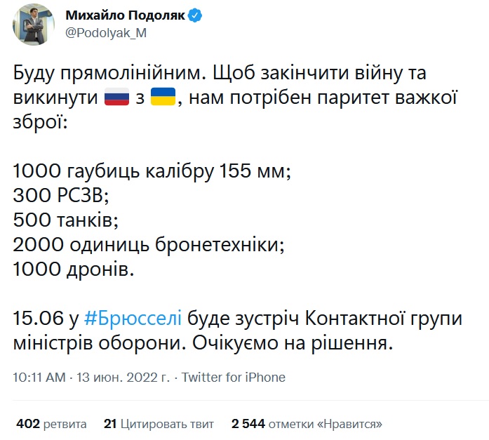 Советник руководителя Офиса президента Украины Михаил Подоляк отмечает, что для завершения войны Вооруженным силам Украины нужен паритет тяжелого оружия. Об этом он написал на своей странице в Twitter.
