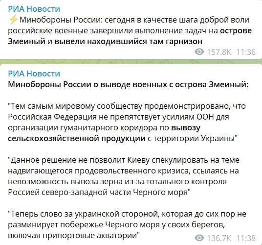 "Сьогодні як крок доброї волі російські військові завершили виконання завдань на острові Зміїний і вивели гарнізон, що знаходився там. Світовій спільноті продемонстровано, що Російська Федерація не перешкоджає зусиллям ООН для організації гуманітарного коридору з вивезення сільськогосподарської продукції з території України. Тепер слово за українською стороною, яка досі не розміновує узбережжя Чорного моря біля своїх берегів, включаючи припортові акваторії", - заявили в Міноборони РФ.