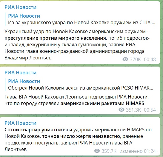 Що цікаво, росЗМІ пишуть, що це досі "детонує селітра". За словами ставленика РФ Володимира Леонтьєва, "наслідки удару України по Новій Каховці можна порівняти з вибухом у Бейруті, де вибухнула селітра". До цієї версії вони не могли визначитись у своїй брехні. Спочатку писали, що українські військові влучили в ГЕС, потім - у лікарню і житлові будинки, ще потім - у центр російської гуманітарної допомоги.
