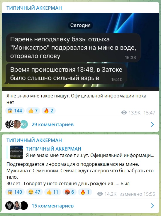 На Одещині молодий чоловік підірвався на міні у свій день народження. Нехтуючи забороною, молодик пішов купатись. Інформацію про смертельний випадок, яку спершу розповсюдили у соцмережах, підтвердив речник Одеської військової адміністрації Сергій Братчук.