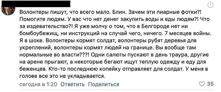 Більше того, мешканці Бєлгородської області вимагають від місцевої влади захистити регіон. Росіяни кажуть, що не розуміють, як діяти, якщо ЗСУ опиняться на території їх області, а також не знають, де знаходяться найближчі бомбосховища. Також вони просять спрямувати кошти на підтримку російської армії, натомість відмінивши скасувати масові свята.