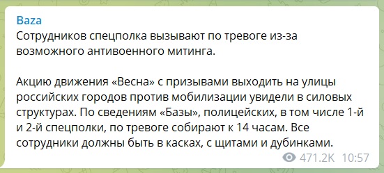 Тим часом поліцейських у Москві викликали по тривозі через можливий антивоєнний мітинг. Усі співробітники повинні бути в касках, зі щитами та кийками. Уся справа в тому, що російський правозахисний рух "Весна" закликав росіян сьогодні виходити на протести проти мобілізації о 19:00 на центральні площі міст. Цей молодіжний рух оголосив про всеросійську акцію протесту проти мобілізації під гаслом "Ні могилізації".