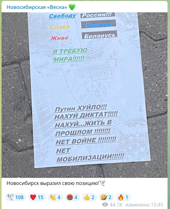 "Ми вважаємо, що Путін перетнув останню межу. Він поставив на кін всю Росію та життя всіх її громадян. Ми маємо чинити опір так люто, як ніколи. Виходьте на акції протесту по всій Росії!", - закликали у правозахисному русі "Весна".
