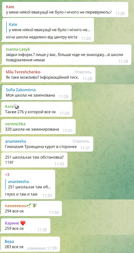 Насправді ж повідомлення про "замінування" отримали навчальні заклади у багатьох районах столиці, проте не всі. Зокрема, "замінували" школи в центрі міста, на Виноградарі, на Осокорках та Троєщині.