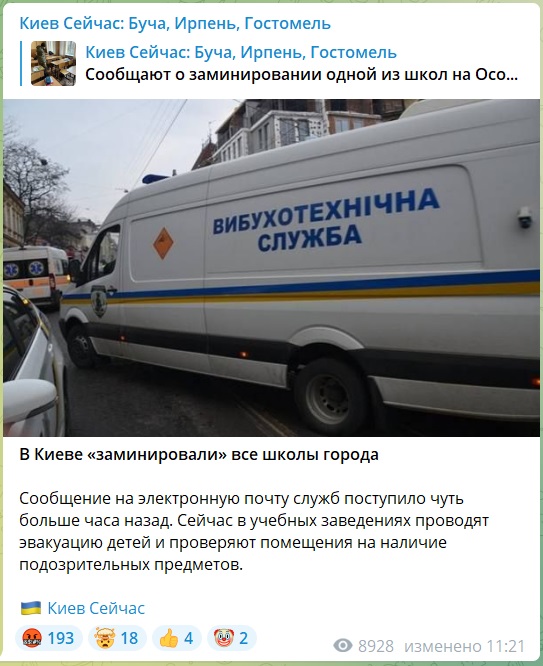 "Повідомлення на електронну пошту служб надійшло трохи більше години тому. Наразі у навчальних закладах проводять евакуацію дітей та перевіряють приміщення на наявність підозрілих предметів", - таке повідомлення опублікували в соцмережах, і його поширив та досі не видалив один політичний діяч.