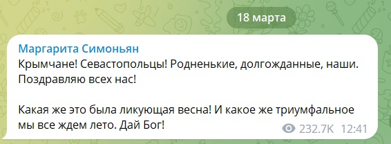 "Яка ж це була радісна весна! І яке ж тріумфальне ми всі чекаємо літо. Дай Бог", - наверзла пропагандистка.