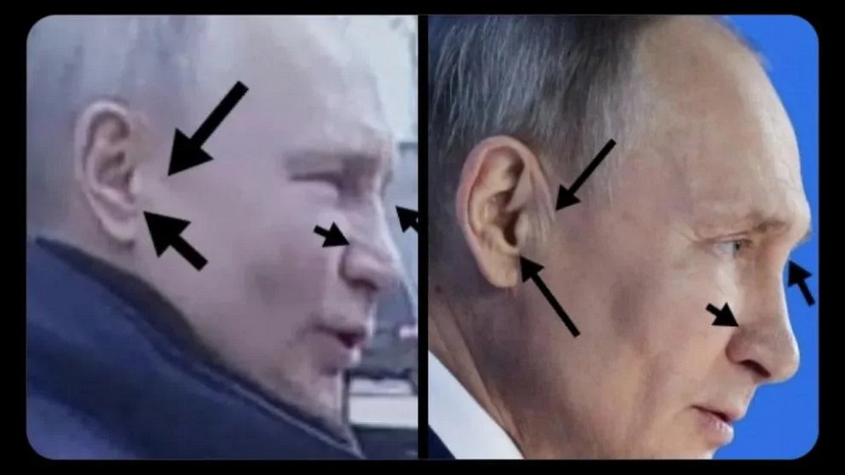 - Вуха: мочки різні, складки біля основи іноді є, іноді немає, відстань між очима та вухами різна: рот - вухо - дисбаланс. Є важливий нюанс - біометричні та інші показники вуха "путіних" не збігаються, а форму вух як відбитки пальців підробити практично неможливо.