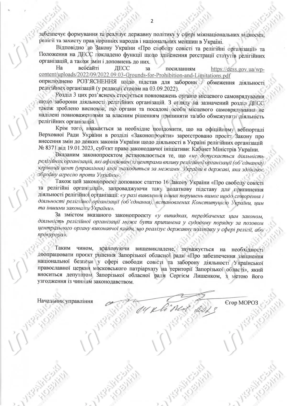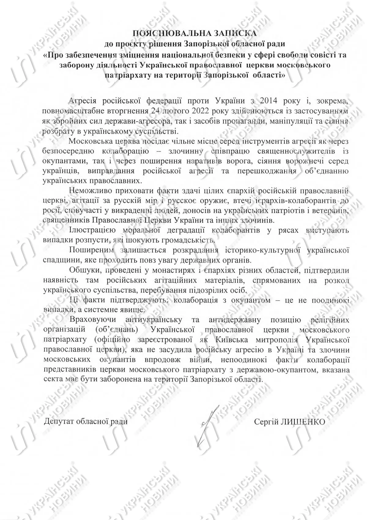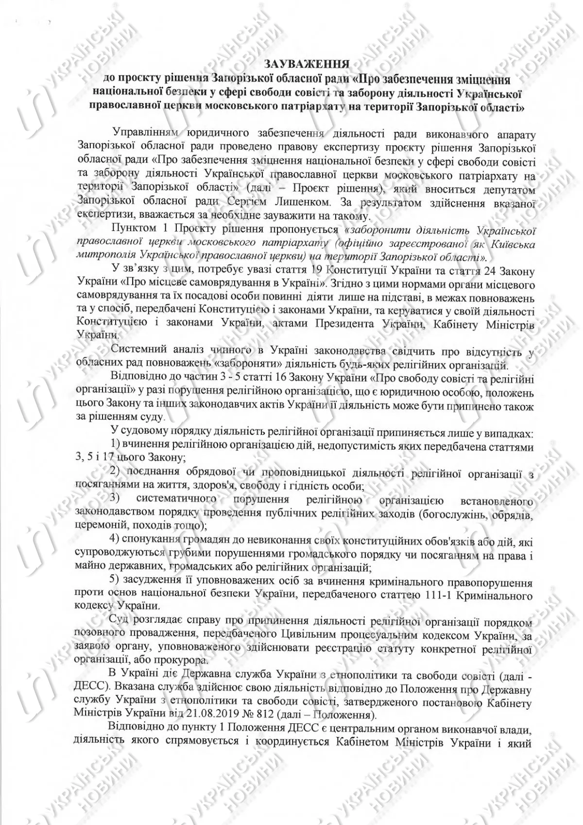 Обидва посадовці, шляхом надання офіційних письмових зауважень, фактично заблокували можливість швидкого розгляду та прийняття проєкту рішення "Про забезпечення зміцнення національної безпеки у сфері свободи совісті та заборони діяльності Української православної церкви Московського патріархату на території Запорізької області", поданого депутатом Сергієм Лишенком.