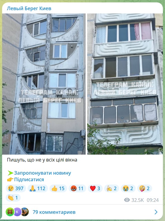 У київських телеграм-каналах повідомляють, що на Позняках у деяких будинках також повибивало вікна. Кому з місцевих пощастило - лише повідкривало вікна вибуховою хвилею.