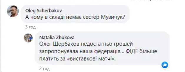 "Недостатньо грошей запропонувала наша федерація. Міжнародна шахова федерація більше платить за "виставкові матчі", – написала Жукова на сторінці Української шахової федерації.