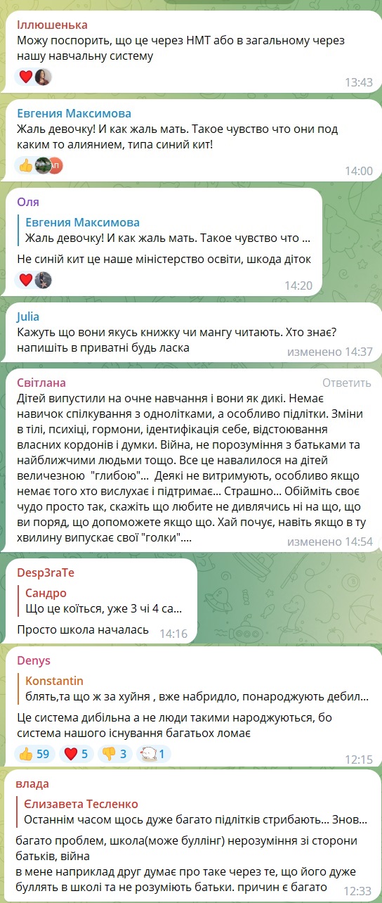 У коментарях під дописом про трагедію підписники у численних коментарях висловлюють одну й ту саму думку. Вважають, що непоодинокі самогубства шляхом стрибків з висоти підлітків пов’язані, в першу чергу, із неадаптованістю дітей в соціумі. Протягом 3,5 років діти були закриті у домівках, завдячуючи оголошеній пандемії коронавірусу, а в подальшому війні. Ось про що пишуть українці: