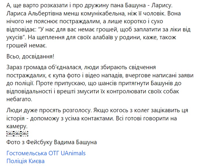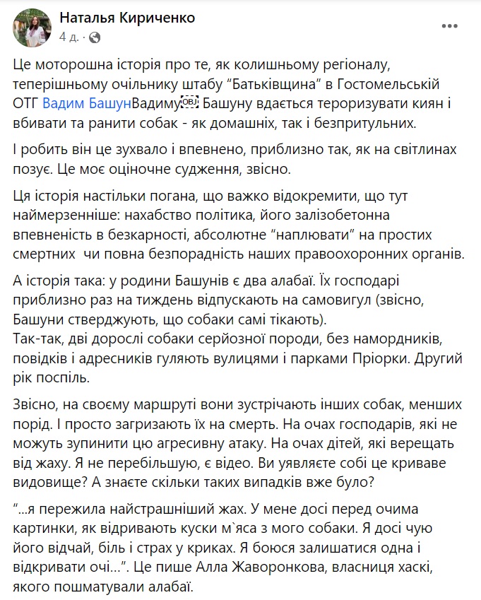 "Це моторошна історія про те, як колишньому регіоналу, теперішньому очільнику штабу "Батьківщина" в Гостомельській ОТГ Вадиму Башуну вдається тероризувати киян і вбивати та ранити собак – як домашніх, так і безпритульних. Так-так, дві дорослі собаки серйозної породи, без намордників, повідків і адресників гуляють вулицями і парками Пріорки. Другий рік поспіль", – розповіла Кириченко.