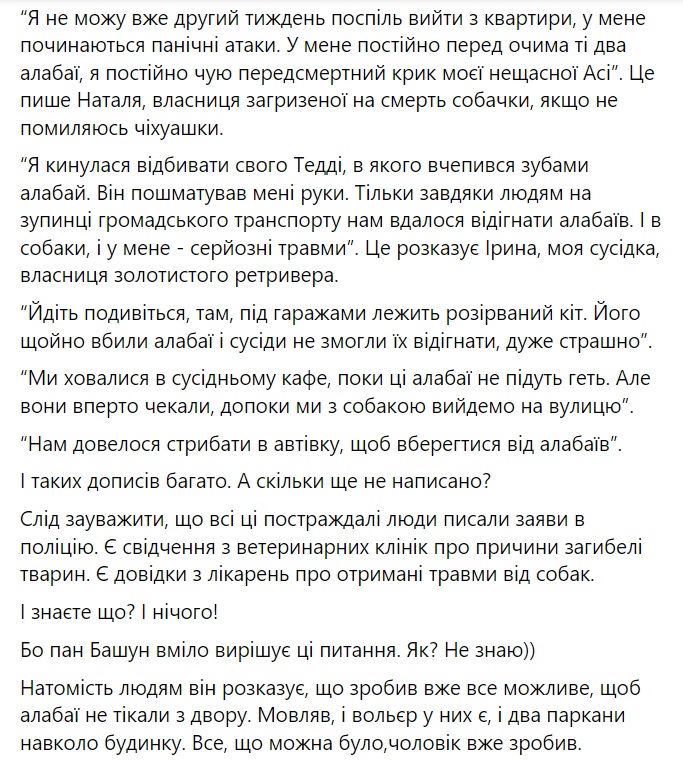 "Я кинулася відбивати свого Тедді, в якого вчепився зубами алабай. Він пошматував мені руки. Тільки завдяки людям на зупинці громадського транспорту нам вдалося відігнати алабаїв. І в собаки, і у мене – серйозні травми". Це розказує Ірина, моя сусідка, власниця золотистого ретривера", – процитувала одну з потерпілих Кириченко.