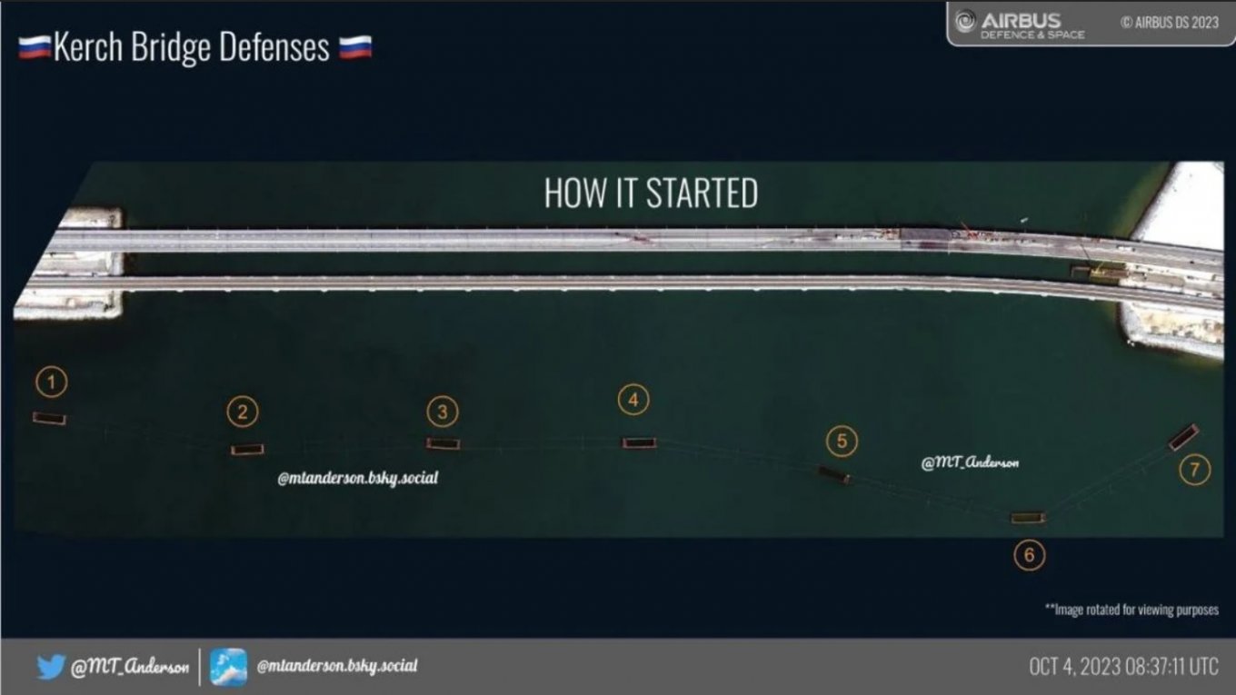 Внаслідок потужного шторму, який вирував кілька днів тому в Криму, сильно постраждала споруждена окупантами оборона Кримського мосту. Про це свідчать супутникові знімки, які опублікував у соцмережі Х (раніше –Twitter ) аналітик MT_Anderson. Більшість барж перед мостом змило чи затопило.