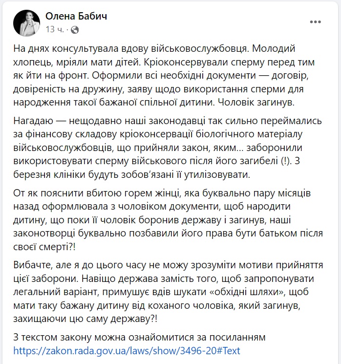 Як він пояснив, цей закон стосувався військовослужбовців, які внаслідок травми втратили можливість мати дітей. Питання загиблих захисників документ не враховував. Це, за його словами, суперечило статті 248 Цивільного кодексу України, яка передбачає припинення представництва за довіреності після смерті довірителя.