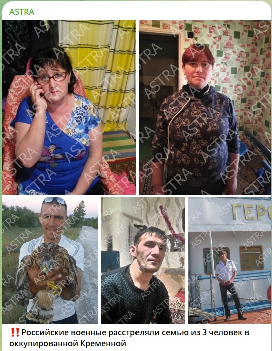 В окупованій російськими загарбницькими військами Кремінній Луганської області розстріляли сім'ю. Про це повідомляє російський Telegram-канал Astra.