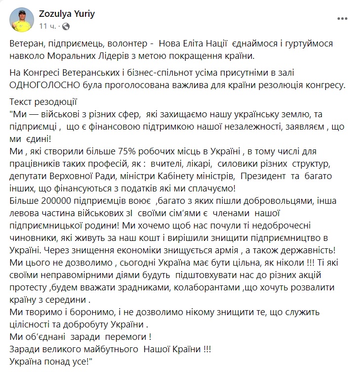 На Конгресі ветеранські спільноти й бізнес погодили резолюцію щодо державних політик, зокрема в сфері розбудови ОПК, ветеранських політик, економічної стійкості і свободи, посилення обороноздатності та Плану відбудови та модернізації України. Ця резолюція має бути представлена політичній владі та міжнародним партнерам. Юрій Зозуля на Конгресі висловив свої пропозиції, які також увійшли в резолюцію.