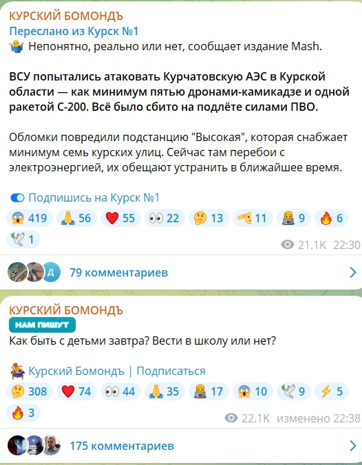 Російське видання Mash пише, що ЗСУ спробували атакувати Курчатівську АЕС у Курській області — як мінімум п'ятьма дронами-камікадзе та однією ракетою С-200. Звісно ж, як завжди переконують пропагандисти, "усе було збито на підльоті силами російської ППО". Пишуть, нібито уламки пошкодили підстанцію "Висока", яка живить щонайменше сім курских вулиць. Наразі там перебої з електроенергією, їх обіцяють усунути найближчим часом.