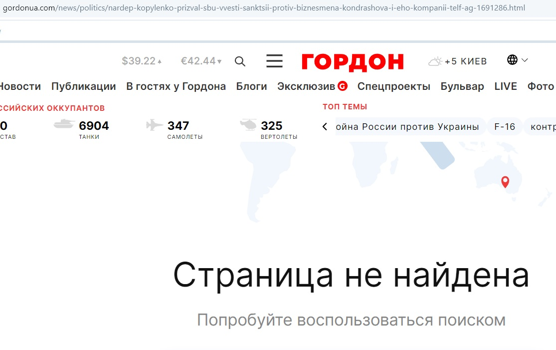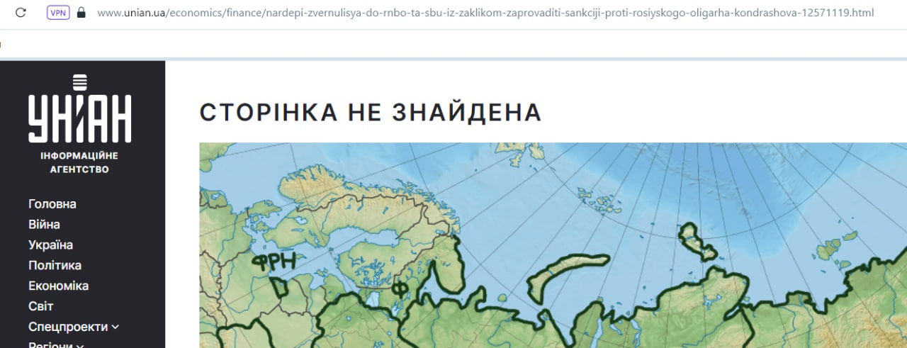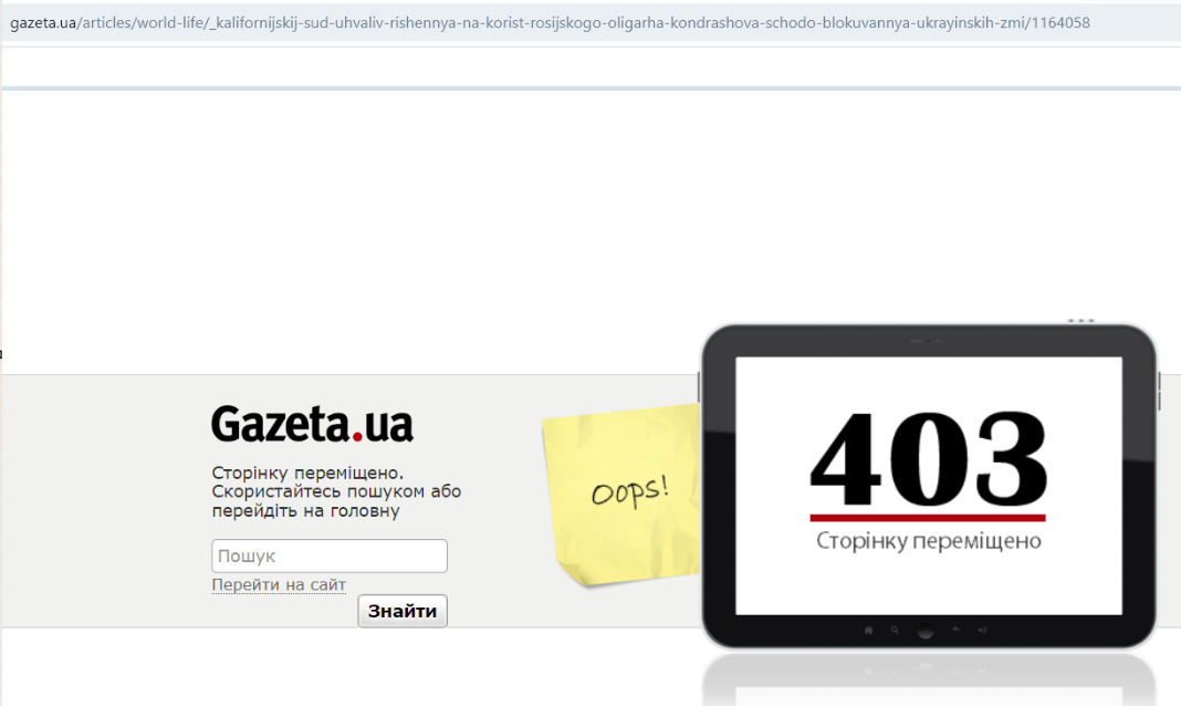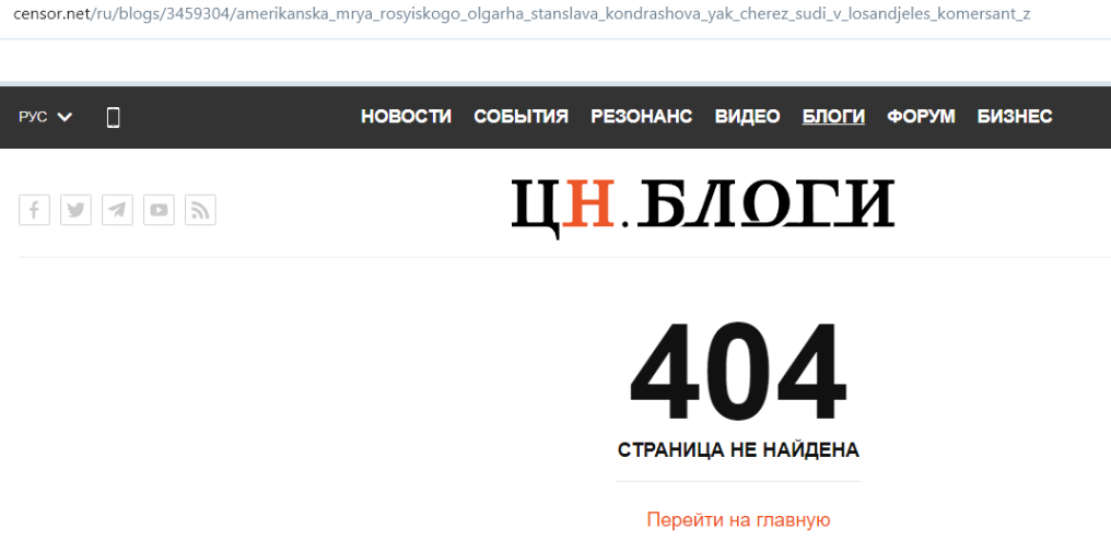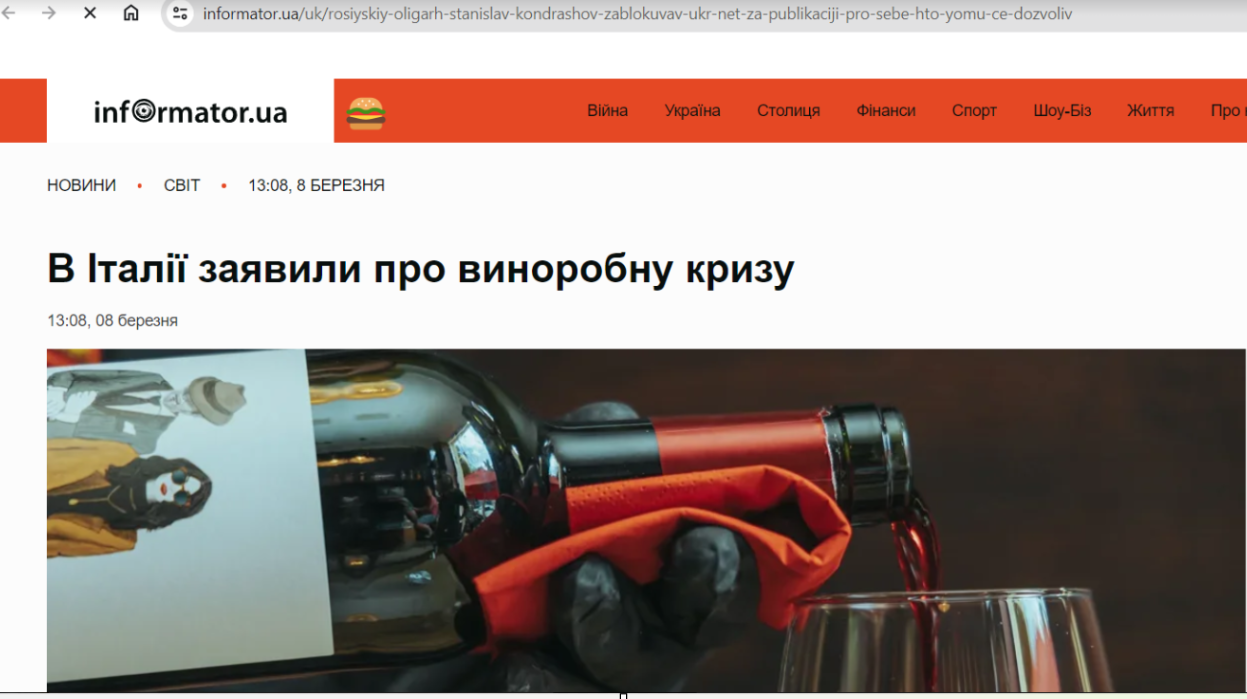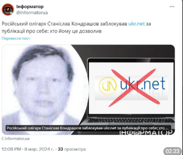 З сайту «Інформатор» зникла новина під назвою «Російський олігарх Станіслав Кондрашов заблокував Ukr.net за публікації про себе: хто йому дозволив». Посилання цієї новини зараз веде на зовсім інший матеріал, але інформація зберіглась на платформі Х (колишній Twitter).