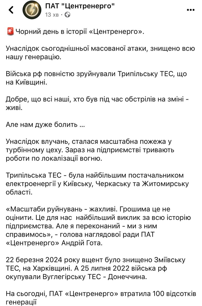 Пізніше стало відомо, що внаслідок масованої атаки російських військ уся генерація ПАТ "Центренерго" була повністю знищена.