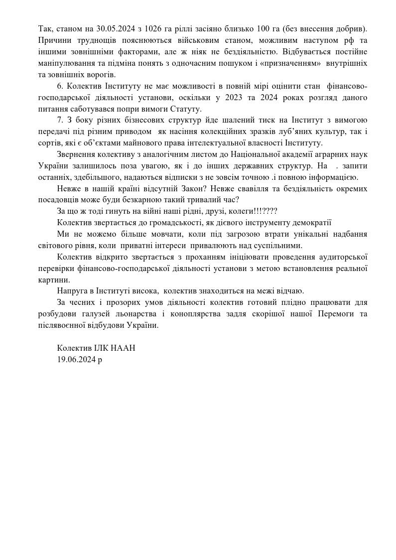 За чесних і прозорих умов діяльності колектив готовий плідно працювати для розбудови галузей льонарства і коноплярства задля скорішої нашої Перемоги та післявоєнної відбудови України”, – йдеться в зверненні.