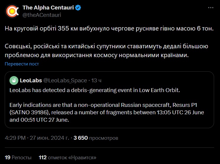 У освітньому телеграм-каналі Alpha Centauri, який публікує новини космонавтики та астрономії, констатували, що совєцькі, російські та китайські супутники ставатимуть дедалі більшою проблемою для використання космосу нормальними країнами.