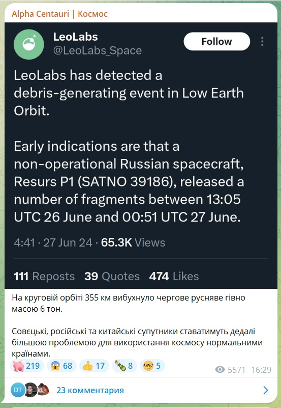 "За попередніми даними, непрацюючий російський космічний апарат "Ресурс П1" (SATNO 39186) розвалився на численні фрагменти між 13:05 UTC (16:05 за київським часом, - Ред.) 26 червня та 00:51 UTC (03:51 за київським часом, - Ред.) 27 червня", - йдеться у повідомленні космічного радару LeoLabs у соціальній мережі Х.