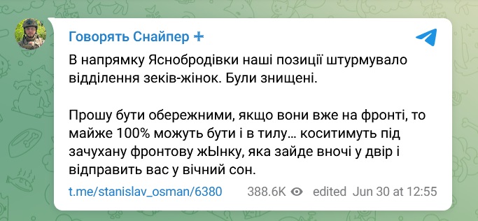 "Прошу бути обережними, якщо вони вже на фронті, то майже 100% можуть бути і в тилу… коситимуть під зачухану фронтову жЫнку, яка зайде вночі у двір і відправить вас у вічний сон", – попереджає боєць "Айдару".