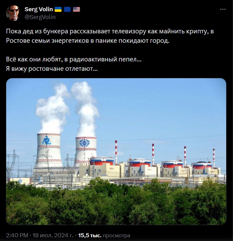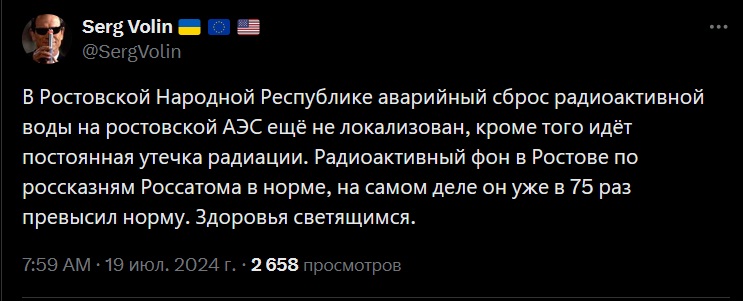 "Радіоактивний фон у Ростові, за даними Россатома, в нормі, насправді він уже у 75 разів перевищив норму", - пише блогер Serg Volin.