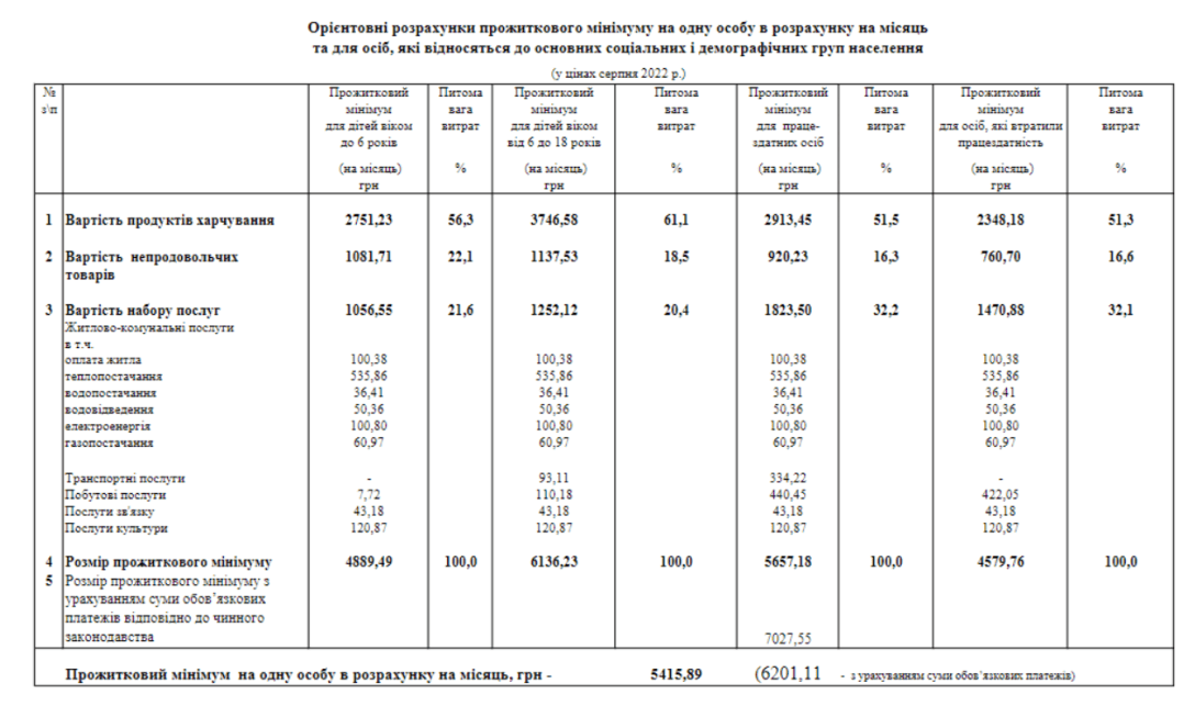 За даними Міністерства, витрати на харчування становлять трохи більше 3700 грн., на непродовольчі товари — 1196 грн., на комунальні платежі — 1200 грн., а на послуги зв'язку — 67 грн.