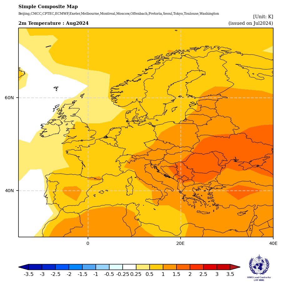 На карті представлений мультимодельний прогноз (заснований на комплексному підході) аномалії температури повітря в Європі на серпень 2024 року, згідно з розрахунками різних прогностичних центрів світу: