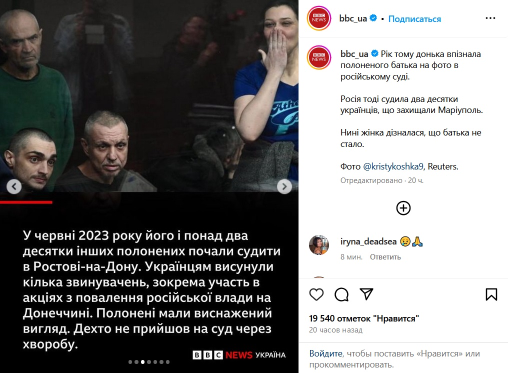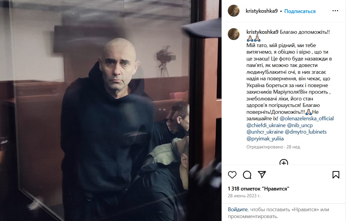 "Це фото буде назавжди в пам’яті. Як можна так довести людину? Блакитні очі, в яких згасає надія на повернення. Він просить знеболювальні, його стан здоров’я погіршується", – розповідала наприкінці червня 2023 року Крістіна.