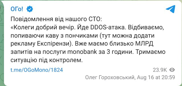 На Monobank здійснюють DDoS-атаку. Про це повідомив співзасновник банку Олег Гороховський на своєму каналі Telegram.