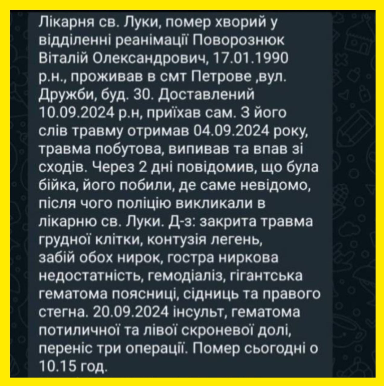 "10 вересня. Закрита травма грудної клітки, контузія легень, забій обох нирок, гостра ниркова недостатність, гемодіаліз, гігантська гематома поясниці, сідниць та правого стегна. 20 вересня. Інсульт. Гематома потиличної та лівої скроневої долі, переніс три операції".