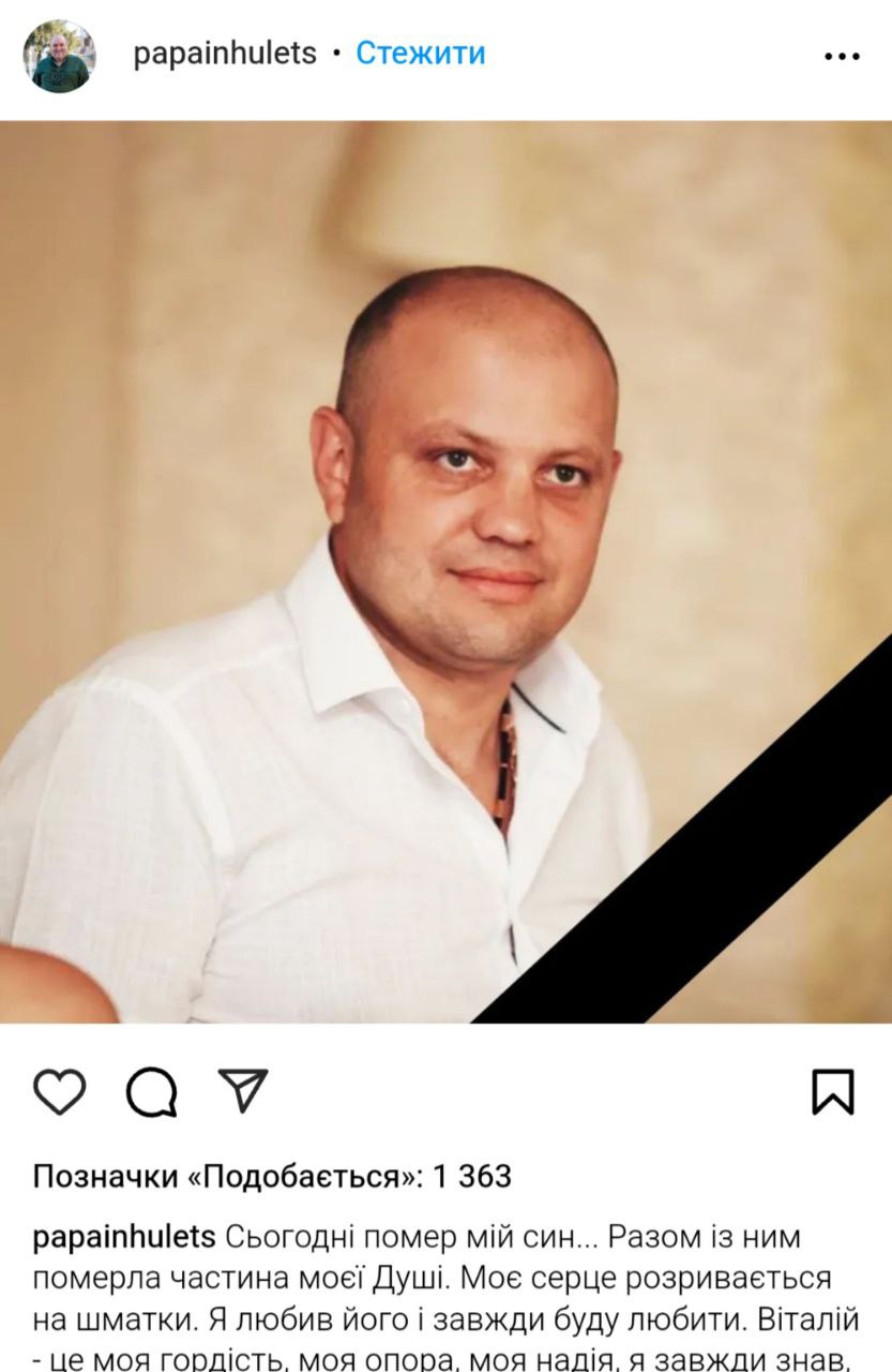 "Сьогодні помер мій син... Разом із ним померла частина моєї Душі. Моє серце розривається на шматки. Я любив його і завжди буду любити. Віталій — це моя гордість, моя опора, моя надія, я завжди знав, що він продовжить мої справи. Він був дуже добрим, щирим, справедливим, співчутливим. З самого дитинства і до сьогоднішнього дня він прагнув допомагати усім, кого знав, хотів, щоб усі були щасливі. Віталій розумний, чесний, мій син самовіддано працював і я бачив, які він робить успіхи. Мені дуже боляче, дуже шкода... Ніколи не міг подумати, що буду хоронити свого сина".